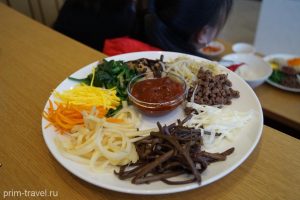 - Чхильчжольпхан (тарелка с 7-ю деликатесами) и пибимпап — рисовая каша с овощами, кусочками жареной говядины и морской капусты. Время/цена: 10:30 – 12:30 / 55 000 вон