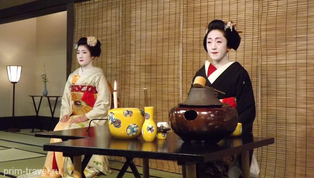 9.  Повстречать гейшу.  Для встречи с этими «людьми искусства» стоит наведаться в Киото.  Настоящих гейш,  владеющих искусством услаждать мужчин танцами, песнями и изысканной беседой, осталось не больше тысячи. Основное место их обитания – киотские районы Гион, Камиситикэн и Понтотё. Здесь уточненные красавицы нередко прогуливаются или спешат на встречу с клиентом.  За немалые деньги можно заказать и ужин с гейшами, но здесь придется все сделать заблаговременно. День в день – это просто не реально. Правда, злые языки шутят: не знающий японского этикета и языка иностранец-гайдзин на таком вечере, все равно, что обезьяна в библиотеке. Если планы распространяются далеко вперед, то стоит выбраться в Киото в апреле. И дело не только в цветущей сакуре.  Именно в  апреле проходит Мияко Одори — один из главных весенних праздников в Японии. Это удивительный фестиваль танца учениц гейш — майко, который обычно стартует 1 апреля и длится в течение целого месяца. Впервые этот фестиваль был проведен аж в 1872 году. В день проводится всего 4 часовых представления. Приходить нужно за час до концерта. Предполагается осмотр сада и музея театра, есть возможность приобрести сувениры. А перед началом спектакля проводится особая чайная церемония — чай заваривает гейша, а прислуживает ей парочка майко. После чаепития с местной сладостью блюдце заворачивают в подарок. Язык не является барьером для понимания смыслы картин представления, смысл рассказывают мимика, жесты, музыка и декорации.