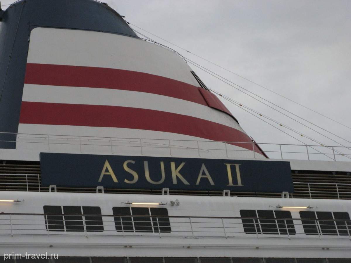 Справка: круизный лайнер Asuka II ходит под флагом Японии. Порт приписки — Йокогама. Судно было заложено в 1989 году, а в 2006 состоялась реновация. Длина судна — 241м, осадка — 7,8м, максимальная скорость 21узел в час. Лайнер располагает 8 пассажирскими палубами, где расположены 436 кают (класс кают от стандарта до класса роял), количество пассажиров – 872 человека, экипаж судна 470 человек. На борту лайнера работают 2 бассейна, 8 баров, казино, фитнесс-центр и кинотеатр на 277 мест, танцевальный клуб.