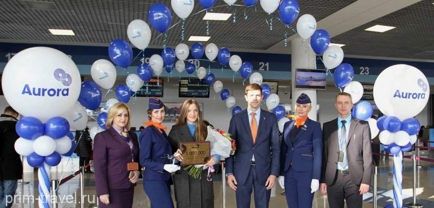 Международный аэропорт Владивосток и базовый перевозчик аэропорта авиакомпания «Аврора» отметили символический юбилей – 5 млн пассажиров авиакомпании. Во время регистрации на рейс представители и авиакомпании торжественно поздравили юбилейного пассажира и вручили памятный сертификат и подарки. Обладательнице счастливого билета также вручили дополнительный бонус от аэропорта — сертификат на посещение зала повышенной комфортности.
