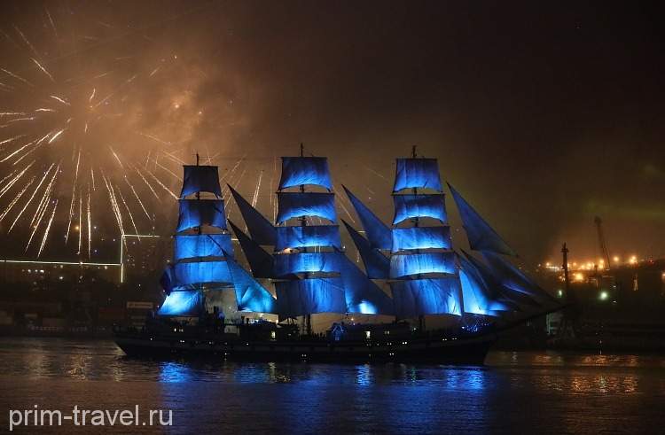 Справка: Праздник выпускников школ Приморского края «Крылья Востока». Световое шоу праздника «Крылья Востока» – уникальный для региона по своей сложности и масштабу проект. Оно является рекордным для России по площади засветки (только в оформлении Золотого моста было задействовано 220 световых приборов и 21,5 километра коммутации), в нем используются самые большие в Европе водные экраны. В программе задействован фрегат «Паллада», являющийся мировым рекордсменом скорости для парусных судов класса «А».