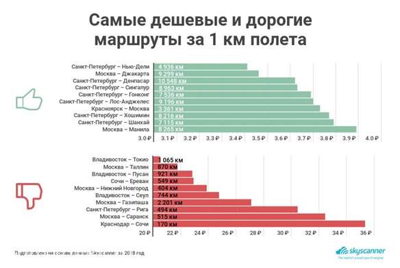 Наиболее дорогостоящими по цене за 1 км стал внутренний рейс Краснодар – Сочи (35,4 руб./км), ближнемагистральный Санкт-Петербург – Рига (30,4 руб./км) и дальнемагистральный Москва – Маврикий (8,82 руб./км).