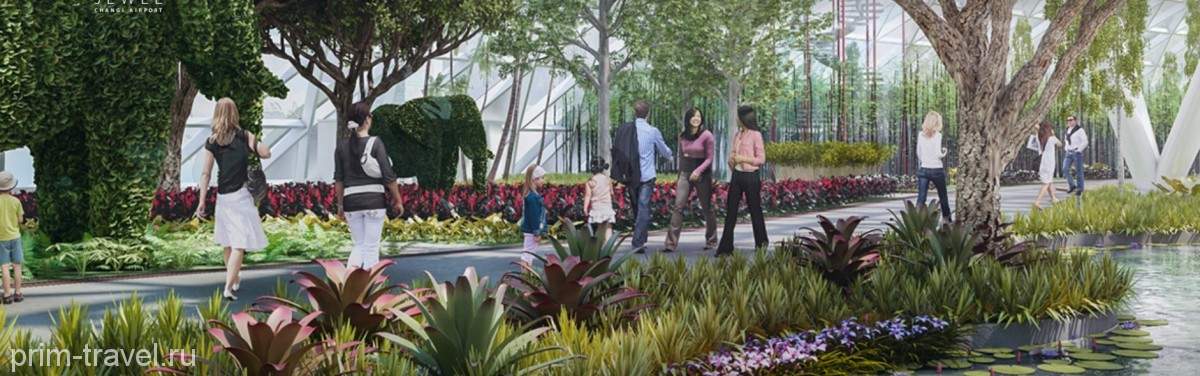 Jewel Changi Airport — это пятиэтажный торговый комплекс и уникальный парк с 2500 деревьями и 100 000 растениями со всего мира, спрятанные под стеклянным куполом. Расположенный в центре купола 40-метровый водопад The Rain Vortex — самый высокий в мире (в закрытых помещениях). В темное время суток водопад превращается в музыкально-световой аттракцион. Вокруг него находятся ухоженные участки лесной долины. Многочисленные игровые аттракционы были созданы для того, чтобы вписаться в уникальную обстановку внутреннего сада и откроются в июне. Здесь представлены несколько форматов розничной торговли, а в отеле можно забронировать номер-каюту минимум на четыре часа, что идеально подходит для коротких остановок или ночевок.
