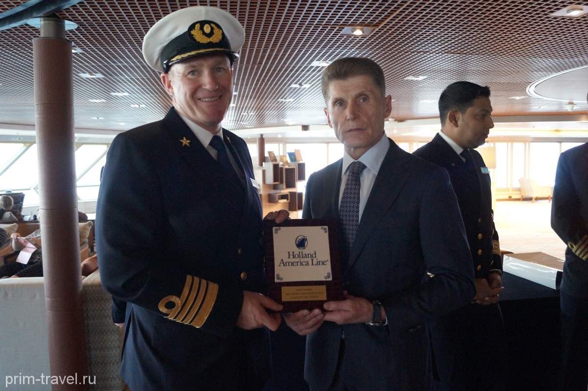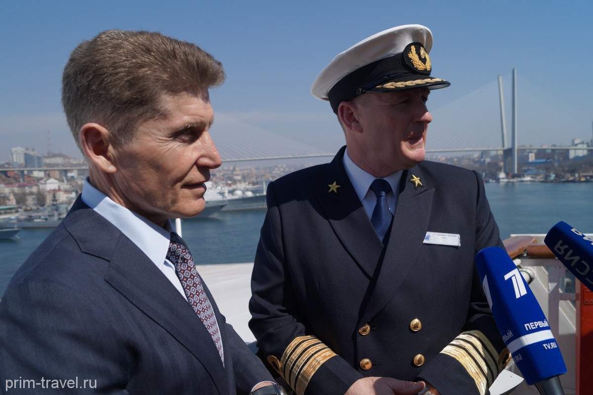 Помимо обмена приветствиями, глава Приморья заинтересовался впечатлениями капитана о посещении Владивостока – условия швартовки, проход по акватории, профессионализм сервисных служб, разнообразие экскурсионных маршрутов для туристов. Вопросы задавались эти неспроста – регион настроен поставить работу таким образом, чтобы заходы лайнеров были регулярными.