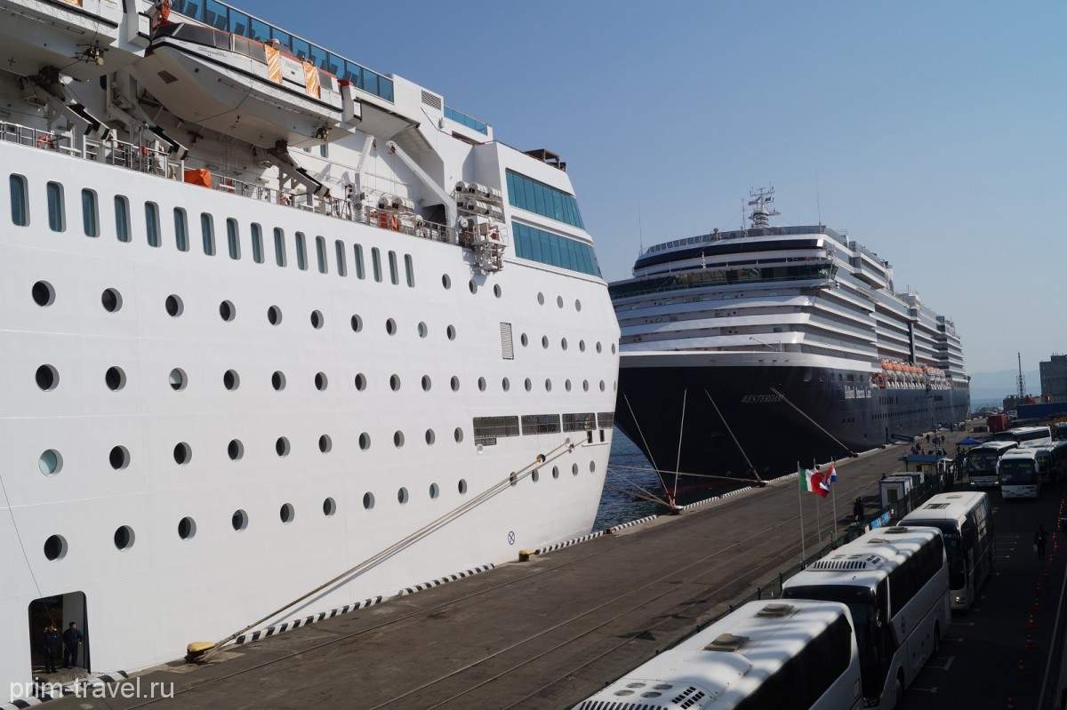Второе судно, пришвартовавшееся у причальной стенки морвокзала, — это уже хороша известная владивостокцам Costa NeoRomantica. Общая длина двух лайнеров по борту составляет более 505 метров.