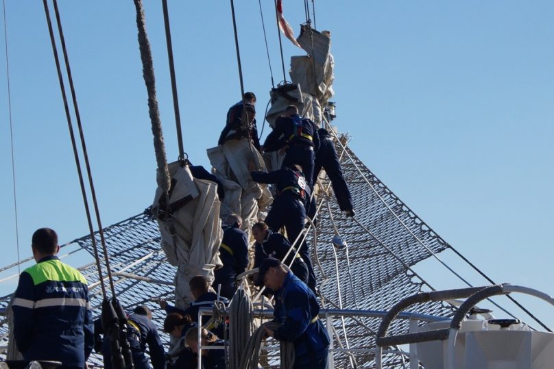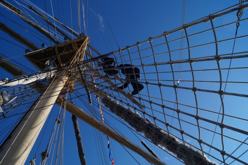 Удалось посмотреть и авральные работы. Раздался сигнал over all и курсанты со скоростью «Феррари» понеслись по палубе для установки парусов. По вантам карабкались и парни, и девчонки. Нам оставалось только вжаться в стенки палубных надстроек, чтобы не путаться под ногами у молодых и активных и не зацепиться за разложенные в определенном порядке канаты.