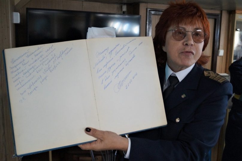 «Когда мы впервые пришли на черноморскую регату, то бесспорным победителем всех регат был парусник «Мир». И тогда никто не сомневался в его победе. Поэтому все рекламные буклеты были заготовлены заблаговременно и там красовался «Мир» и соответствующая надпись «Парусник-победитель черноморской регаты – 2014». Как и положено по утвержденному заранее протоколу, Президент страны Владимир Путин должен был подняться на борт парусника-победителя. Но пришла на регату «Надежда» и выиграла ее, — рассказывает гостям Елена Девятова, показывая фотографии, где на горизонте «Мир» пытается догнать уверенно лидирующую «Надежду», а члены приморской команды фотографируются на фоне аутсайдера. – И когда Путина привели на «Мир», он удивился, дескать почему он не на борту победителя, и кто же такая «Надежда». После этого специально была изготовлена награда из хрусталя, и Владимир Путин лично вручил ее команде «Надежды».