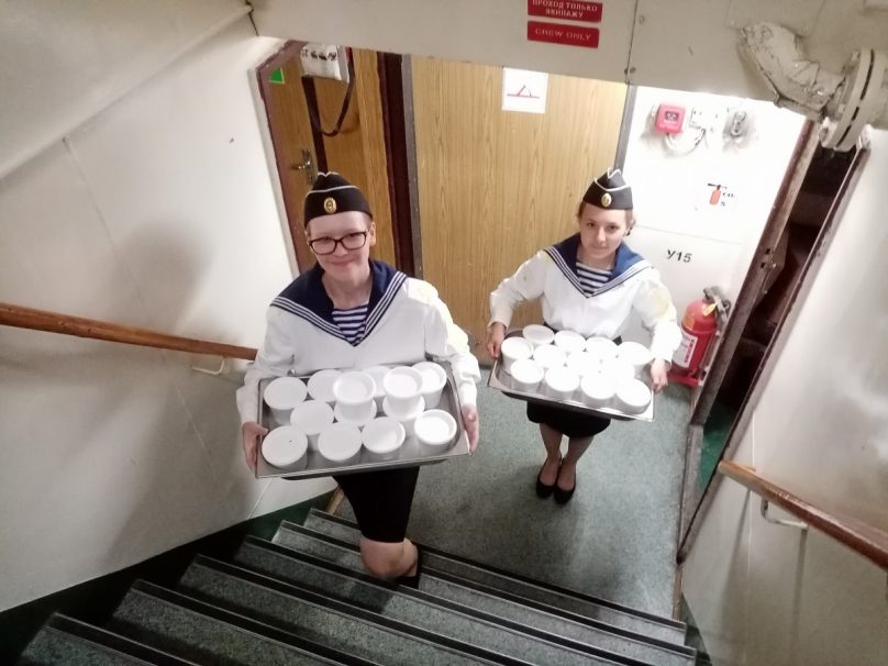 Как оказалось, курсанты все не местные, 40 ребят из Сибирского государственного университета водного транспорта проходят на борту «Надежды» двухмесячную практику. «Я перешла на второй курс, учусь на специальности «Судовождение» и после окончания университета буду штурманом. Выбрала эту профессию осознано. У меня дедушка был капитаном на Черном море, а бабушка на том же судне старпомом. Они много рассказывали мне о море, кораблях, так что все сложилось во едино – династия, рассказы, гены, — рассказывает маленькая улыбчивая Даниэла Сороклет. – Наша практика длится с 14 августа по 2 ноября. И мы на борту судна – матросы. Стоим вахты, складываем и раскладываем паруса, вяжем узлы, драим палубу. Руки в мозолях, но это не страшно. Зато весело и интересно, ведь каждый день что-то новое. А еще на мачты лазим. Поначалу было немного страшно, но что поделаешь. Я ж будущий моряк! Теперь горжусь этим и выбранную профессию ни на что не променяю».