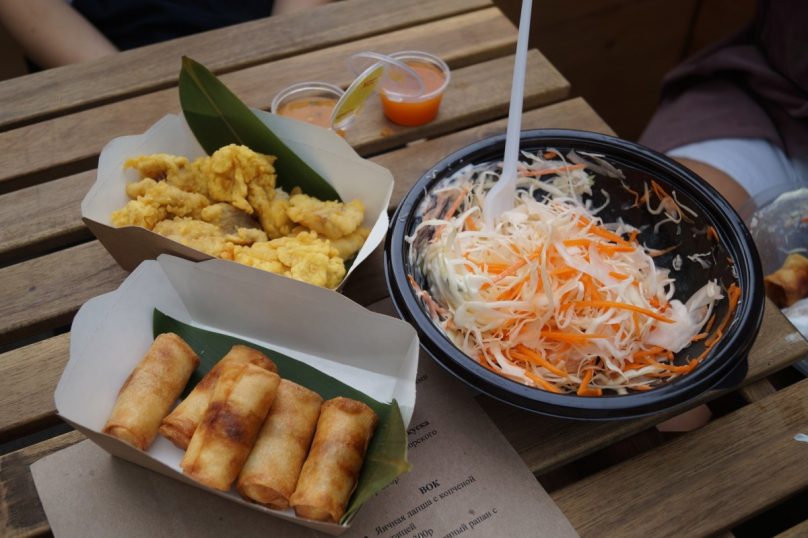 Участниками VLADIFOODSTREET стали интересные гастрономические проекты от лучших ресторанов города — фермерский ресторан «Огонек», проект уличной еды «Криспи» от ресторана «Зума», проект стритфуда и доставки китайской еды в коробочках «Тук-тук» от создателей ресторанов Tokyo, семейная пекарня PieFamily, мясная лавка «Цех» и ресторан индийской кухни Jimmi!Jimmi! Это к слову о разнообразии меню и азиатском акценте. Если говорить о морепродуктах, то на глаза попались креветки, рапан, мидии…