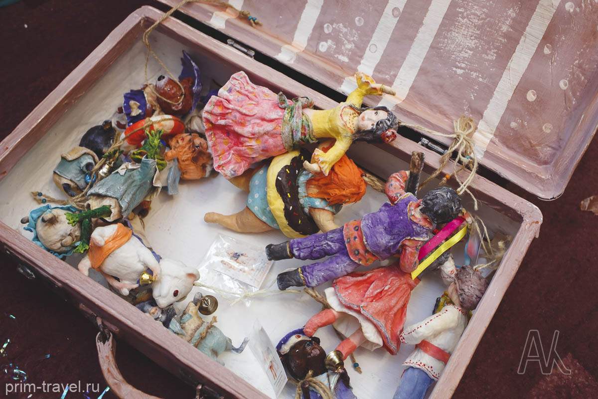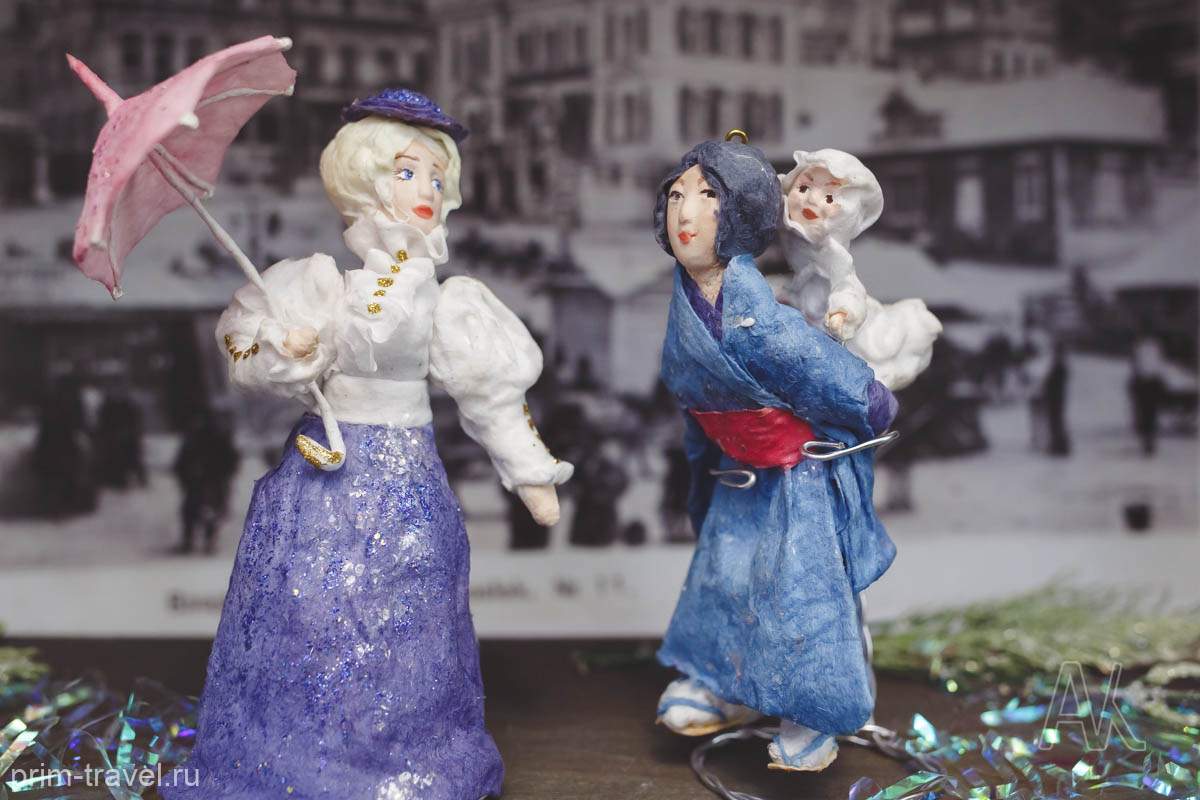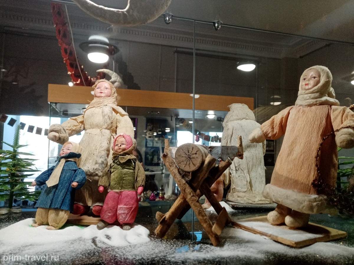 Образ старинного Владивостока можно увидеть в композиции «Дама с няней-японкой»: вплоть до Русско-японской войны 1904–1905 годов состоятельные жители города охотно нанимали на работу японских слуг, которые нередко становились практически членами семьи. Также на выставке много продуманных игрушек с небольшими деталями, требующими от мастера почти ювелирной точности. Чтобы композиция была интересной и привлекала взгляд, нужно не только создать образ, но и продумать элементы одежды фигурок, поставить их в «живую» позу, уложить волосы в причёску и придать лицам подходящее выражение — как, например, в сценках с детьми, играющими в снегу или украшающими ёлку.