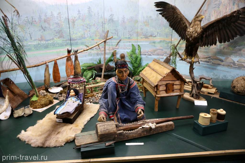 Интересная экспозиция представлена в зале природы и этноса – особую атмосферу создают льющиеся из динамиков звуки природы и национальные песни коренных народов Приморского края.