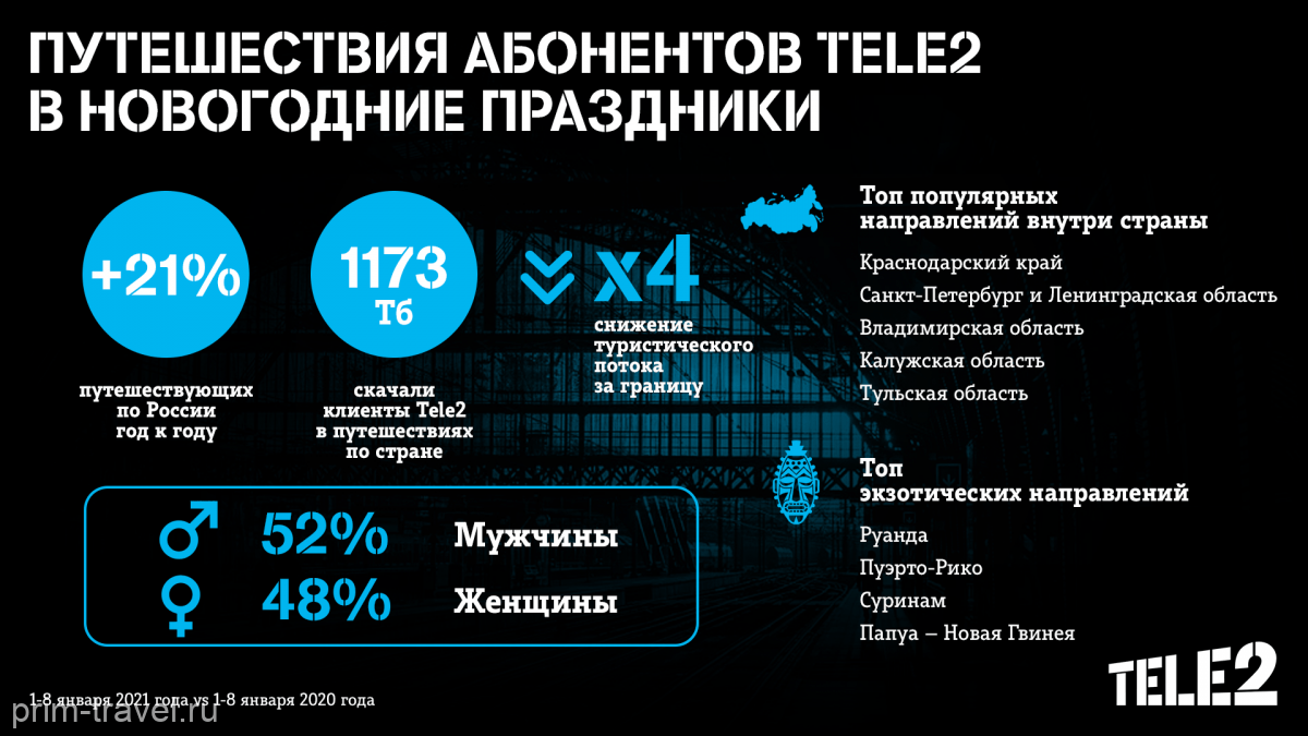 В дни новогодних каникул приморские клиенты Tele2 активно путешествовали по России и за ее пределами. Число абонентов, отправившихся в путешествие по стране в первые дни января, выросло в 2 раза по сравнению с 2020-м. Для своих поездок, как и годом ранее, приморцы предпочли Еврейскую автономию. Количество посещений в соседний регион выросло на 16%. В тройку популярных регионов также вошли Московская и Сахалинская области. В своих поездках по стране туристы скачали более 2 тыс. Гб, что почти в 3 раза больше прошлогодних значений.