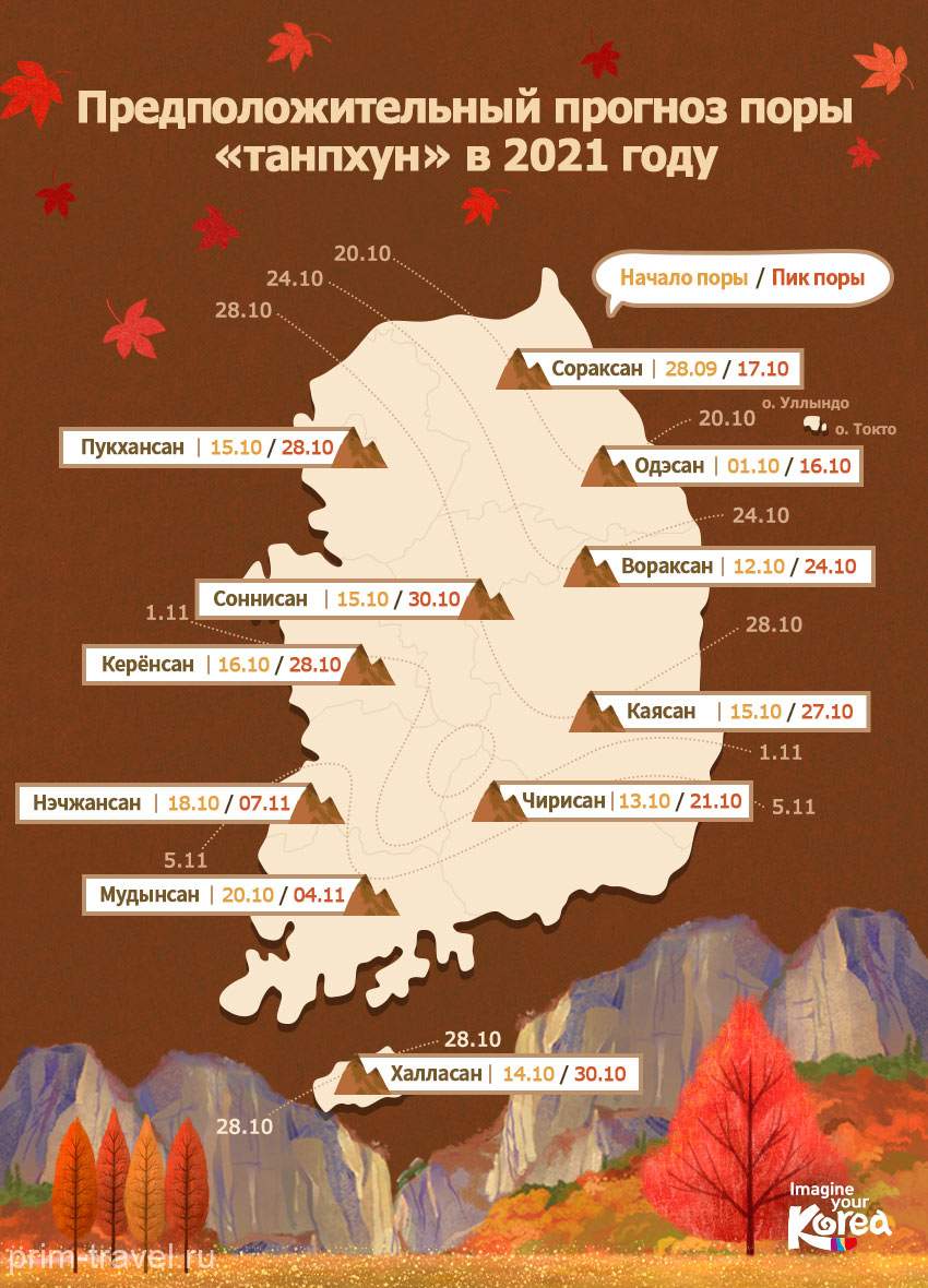 Первыми, в последние дни сентября, сменят цвет листья деревьев в Национальном парке гор Сораксан. В центральном регионе начало так называемой поры «танпхун» придется на период с 15 по 16 октября, а в южном регионе, включая горы Чирисан, деревья начнут окрашиваться в период с 13 по 20 октября.