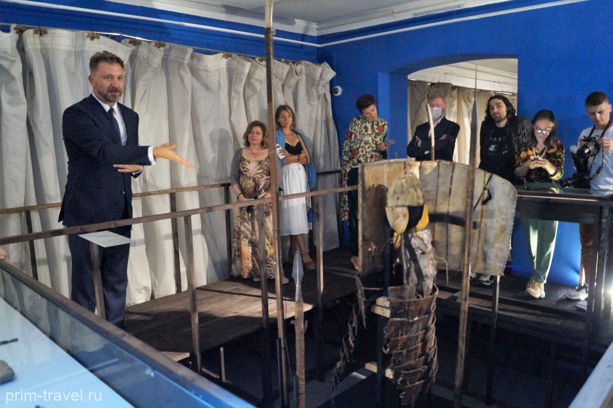 Среди экспонатов есть уникальные, имеющие мировую историческую ценность. Это серебряный крестик прапорщика Ивана Лагунова, члена экспедиции Витуса Беринга, который предоставил для экспонирования Камчатский краевой объединенный музей. И ленточный доспех воина-ительмена из коллекции Музея истории Дальнего Востока. Он из музейной коллекции. Выставляют впервые за много лет. И это единственный сохранившийся в мире экспонат.
