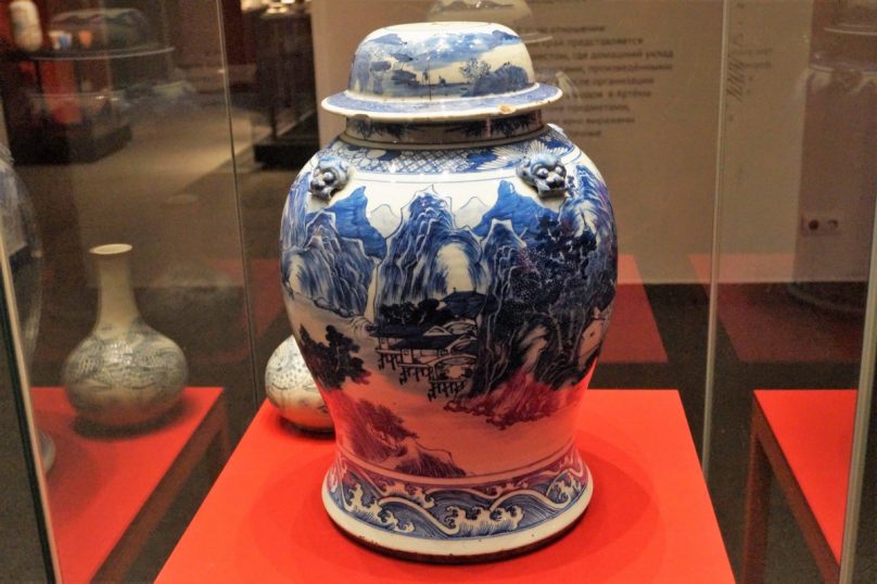 Если посмотреть в шкафах владивостокцев, то наверняка там можно сыскать кружку или тарелку, выпущенную местными предприятиями. Но на самом деле история фарфора берет свое начало не в 60-70-х годах 20 века, а в конце ХIХ века. Предприниматель Алексей Старцев в 90-е годы ХIХ века построил на острове Путятина первый фарфоровый завод. Это был настоящий производственный комплекс, и выпускаемый там фарфор по своим качествам, дизайну, функционалу ни в чем не уступал китайскому и японскому. Говорили, что китайцы ему даже платили за то, чтобы он не вывозил свои сервизы на реализацию в Поднебесную. На заводе выпускалась как элитная, праздничная посуда, так и бытовая. От заказчиков отбою не было. Но выполнялись и индивидуальные заказы, например, расписные блюда и вазы. Одна из таких ваз – высокая, с тонким горлом и синим узором не белой поверхности — представлена в выставочной витрине.