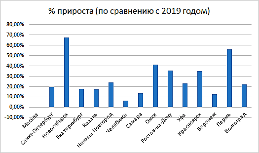 Как указала Марина Гончаренко, «по приросту бронирований отстает только Москва, но по факту, это очень маленький процент, поэтому можно сказать, что Москва восстанавливает свои объёмы от объёмов 2019 года. В среднем, по данным Bronevik.com, прирост бронирований составляет 20-30% по городам-миллионникам. Ориентируясь только на наши данные, мы не можем говорить о полном восстановлении гостиничной индустрии, но то, что взят высокий темп – это точно».