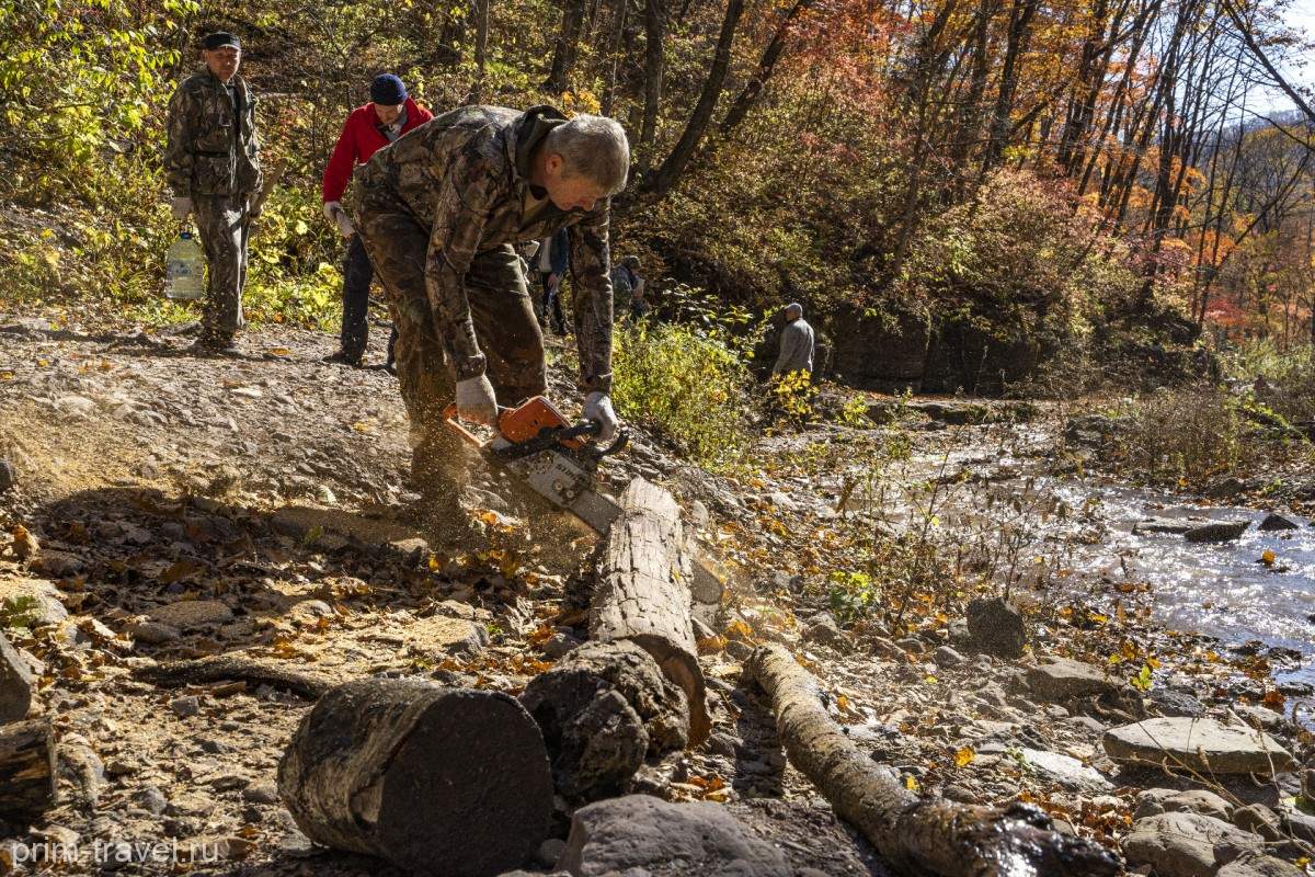 Пять водопадов высотой от четырех до семи метров на ручье Кравцовский – визитная карточка Хасанского района. Объект находится в охранной зоне «Земли леопарда». Объединив усилия, природозащитники и добровольцы приступили к очистке этого красивейшего места в 11 часов утра. «Земля леопарда» обеспечила необходимый инвентарь: перчатки, мусорные пакеты, инструменты. После интенсивной уборки мусора и валежника участники выпили горячего чая с пирогами.