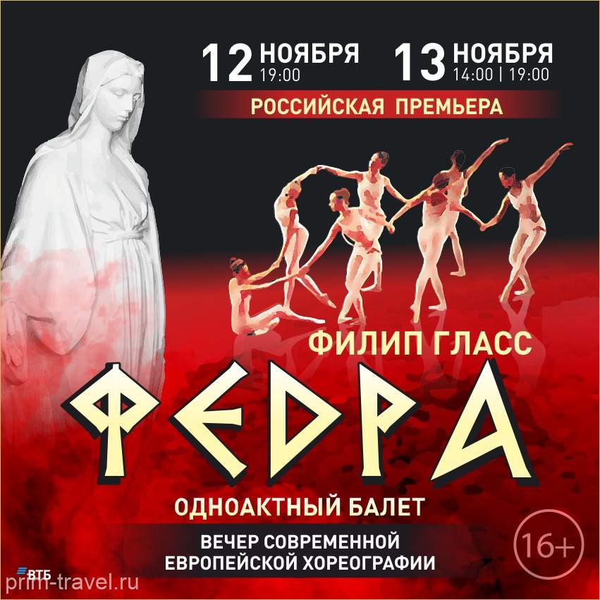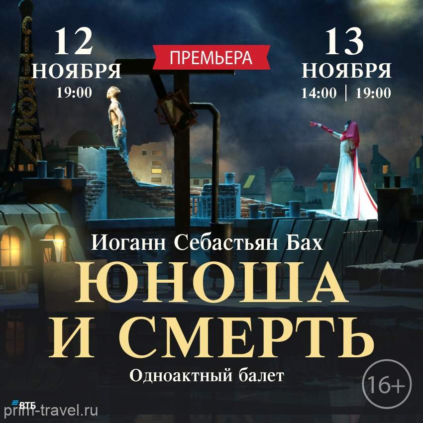 12 и 13 ноября балетная труппа Приморской сцены Мариинского театра приглашает на Вечер современной европейской хореографии, состоящий сразу из двух премьер одноактных балетов выдающихся хореографов XX века: «Юноша и смерть» в хореографии Ролана Пети на музыку Иоганна Себастьяна Баха и «Федра» датского хореографа Флеминга Флиндта на музыку известного американского композитора Филипа Гласса.