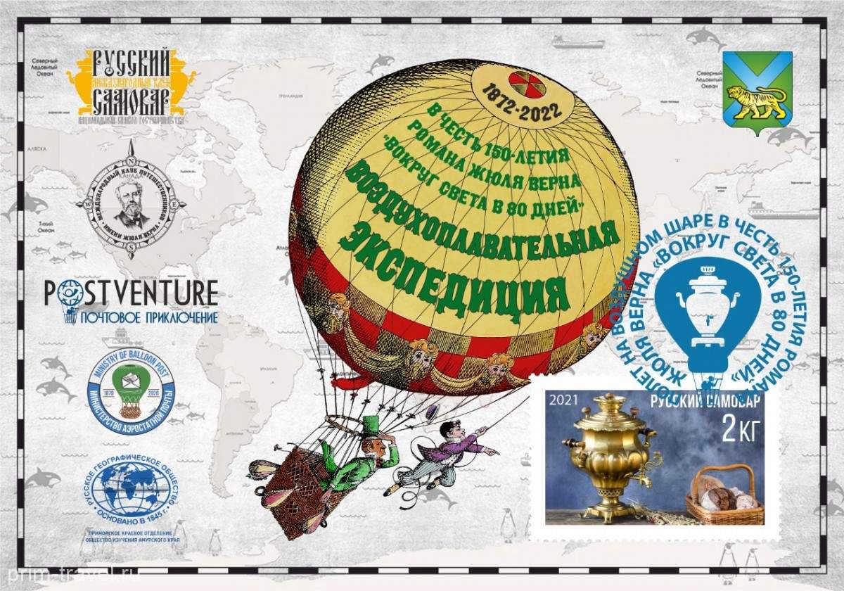 8 февраля 2022 года в 18.00 в конференц-зале Морского вокзала Владивостока (ул. Нижнепортовая, д.1, 2 этаж, г. Владивосток) пройдет церемония спецгашения специального почтового выпуска ограниченного тиража воздухоплавательной экспедиции в честь 150-летия романа Жюля Верна «Вокруг света в 80 дней», в который войдут специальные почтовые конверт, открытка, марка-виньетка, спецгашения и сертификат, побывавшие в воздухоплавательной экспедиции и представленные Аэростатной, Самоварной и Чайной почтами. Данный филателистический выпуск представляет немалый интерес для филателистов и филокартистов.