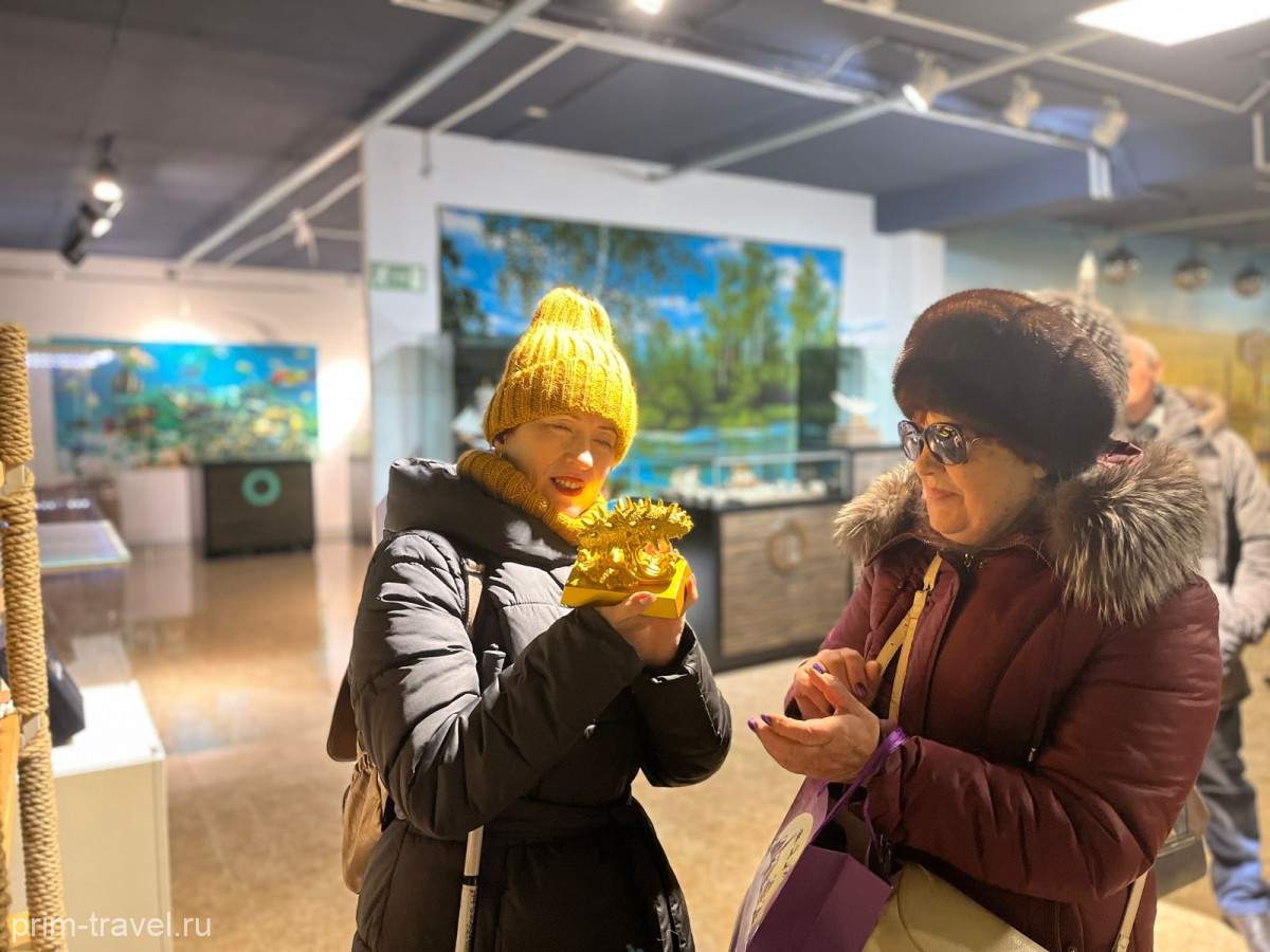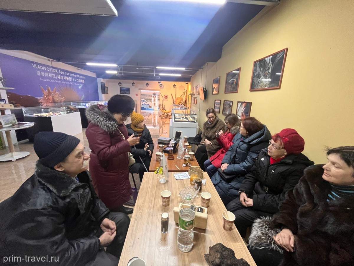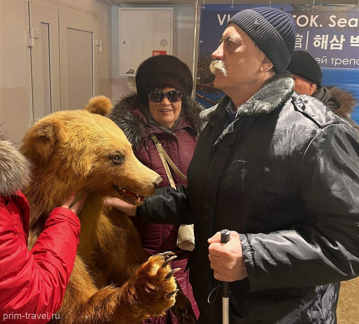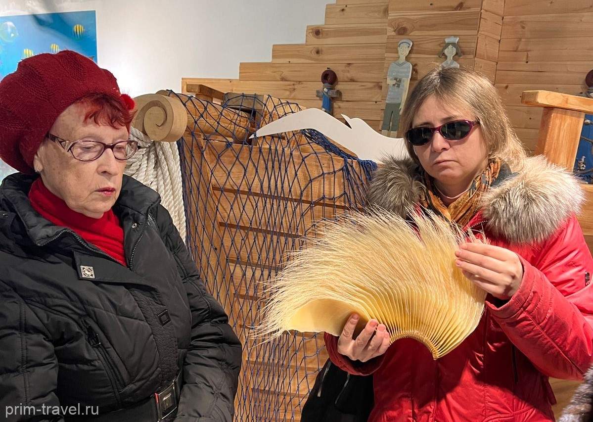 Кроме знакомства с трепангом, участники первой экскурсии познакомились здесь же с русским бытом переселенцев и владивостокцев середины 20-го века. И это стало для них настоящим открытием — потрогать русскую печь, старую посуду, вышитые полотенца, чучело медведя, познакомиться тактильным способом с куклами-оберегами. Получилось потрогать бивни мамонта, китовый ус, который поразил всех своих шершавостью и волосатостью. Если что-то в музее можно рассмотреть на ходу, задержавшись у витрины буквально на минуту, то в данном случае этот номер не прошел. Возможность потрогать, ощутить, почувствовать пальцами компенсировала нехватку визуального чувства.