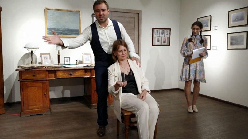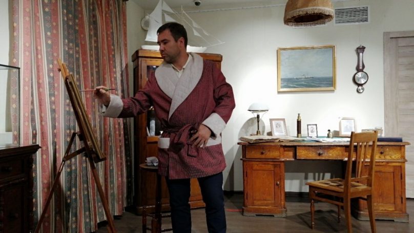 И актер в образе Болтина «ведет» участников экскурсии по жизненному пути своего героя, рассказывая об интересных и важных событиях службы, истории российского флота и становления Приморья на карте России. В помощь — экскурсовод музея. Диалог расписан на двоих: главный герой и автор. И они отлично дополняют друг друга.
