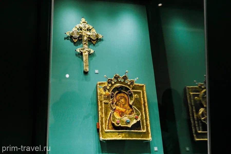 Редко покидает Оружейную палату роскошная группа регалий, используемая на церемонии венчания на царство. Саккос (архиерейское богослужебное облачение), митра (богослужебный головной убор) и поручи (нарукавники), представленные в зале «Венчание на царство», позволяют представить великолепие самого действа. Кстати, поручи патриарха Иоакима за пределами Московского Кремля представлены впервые именно на выставке во Владивостоке.