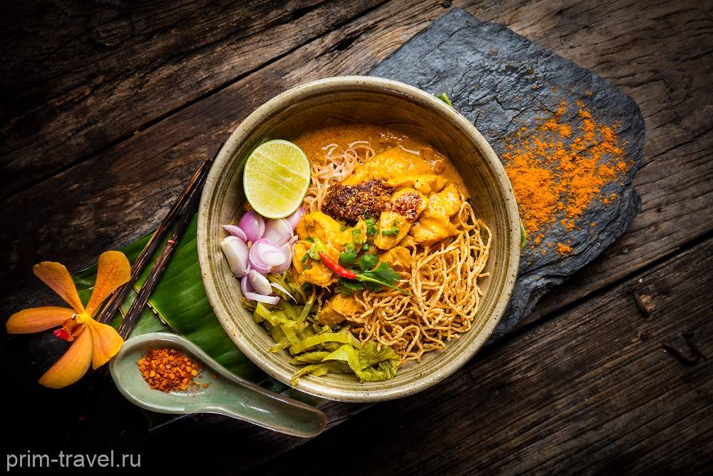 Основное блюдо Северного Таиланда, Кхао Сой — суп с лапшой карри, покрытый жареной во фритюре яичной лапшой — попадает прямо в точку. Продавцы разливают по мискам великолепный сытный сливочный кокосовый бульон с добавлением перца чили на подушке из яичной лапши с куриными ножками или говядиной. На гарнир вы получите зелень горчицы, свеженарезанный лук-шалот, дольки лайма и пасту чили.