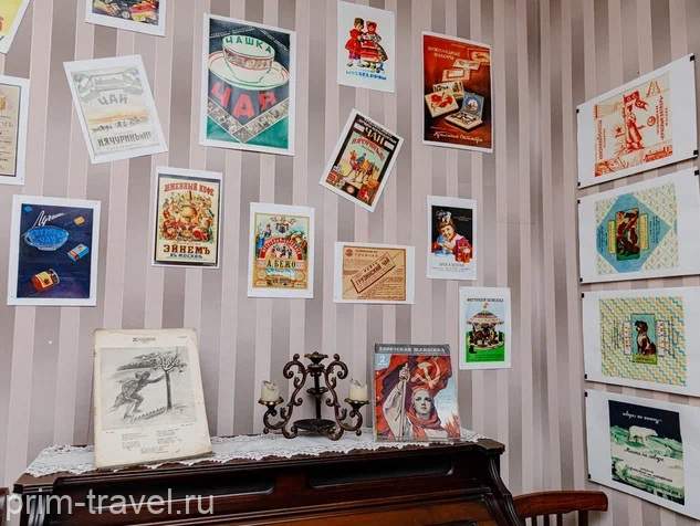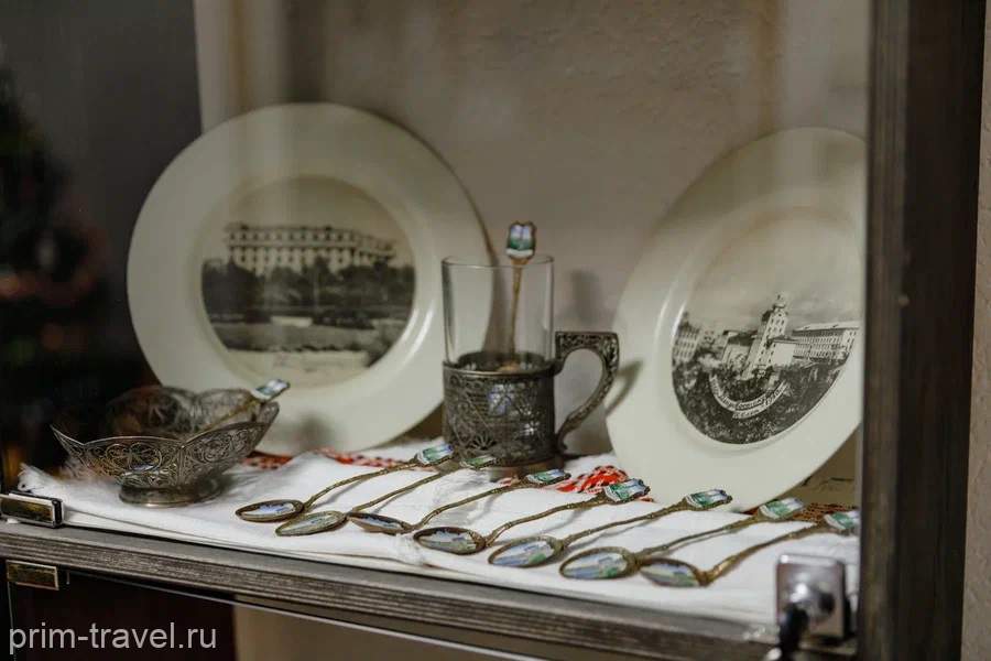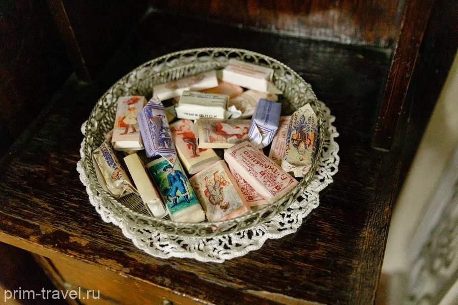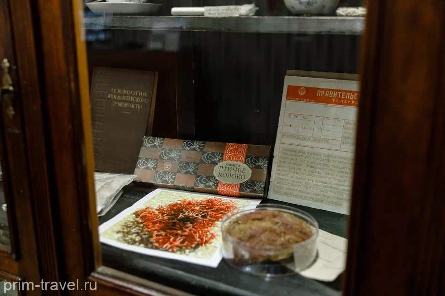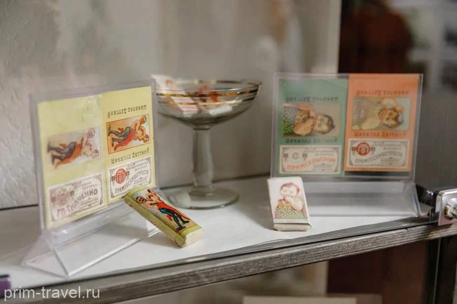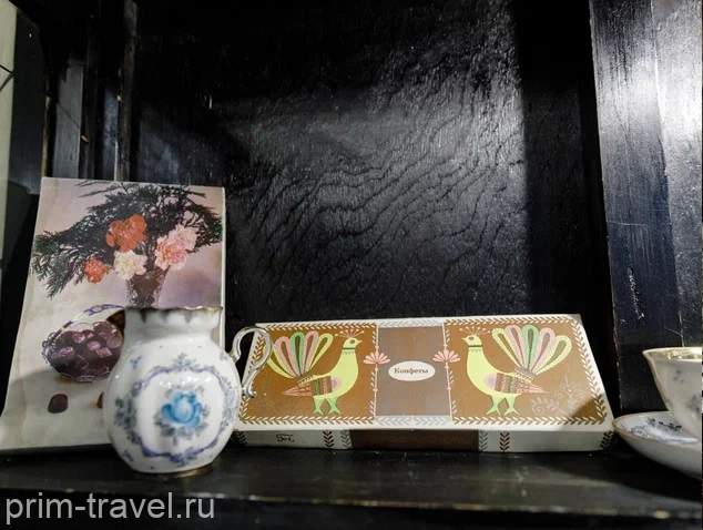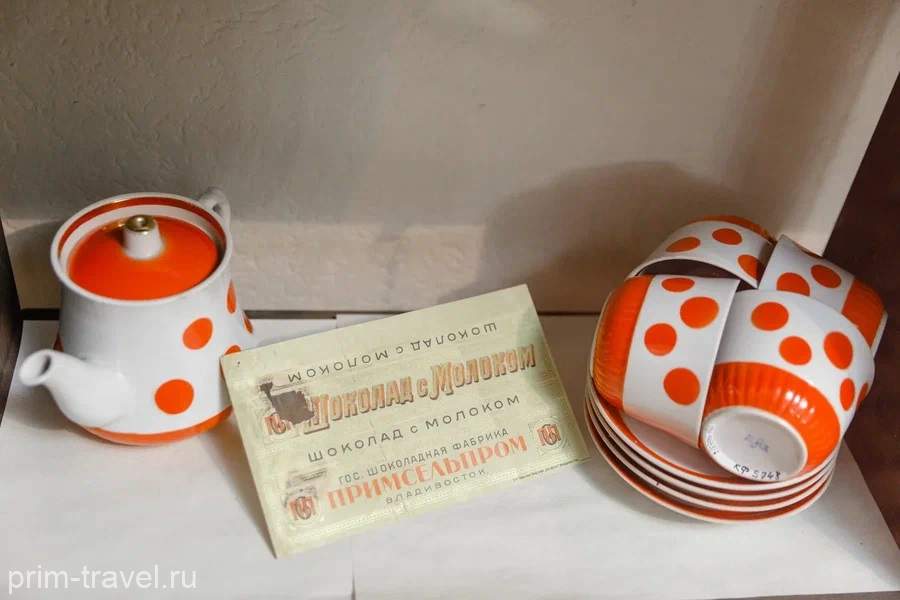 И сейчас разнообразие упаковок, фантиков различного периода, этикетки и ценники – все это можно увидеть на выставке. Дополняет сладкую тему посуда. Среди предметов изящные чайные пары (кстати, увидеть китайский фарфор в семьях приморцев было делом обыденным), тонконогие вазочки для варенья, пролетарские стаканы и подстаканники, большие чашки с огромными цветами. В Приморье были свои фабрики и свой фирменный магазин, где можно было купить фарфоровые изделия.