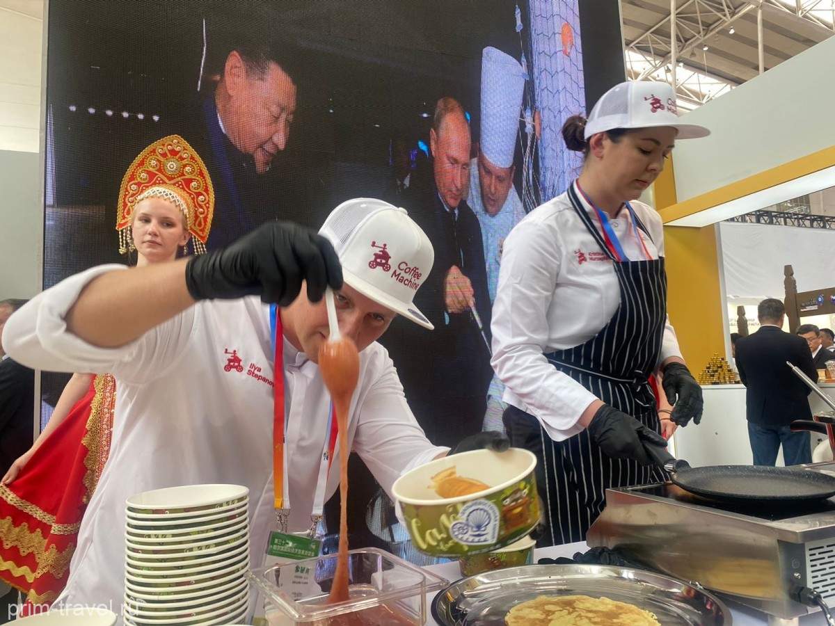 Гастрономические возможности региона были представлены мастер-классами по приготовлению блинов, которыми угощались китайские партнеры и гости ярмарки. Напомним, что в 2018 году в рамках ВЭФ лидеры России и КНР Владимир Путин и Си Цзиньпин готовили блины, и к этому гастрономическому процессу китайский бизнес относится с большим пиететом. В результате за два дня работы ХМТЭЯ на стенде Приморского края было приготовлено более 800 блинов.