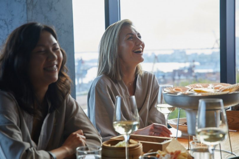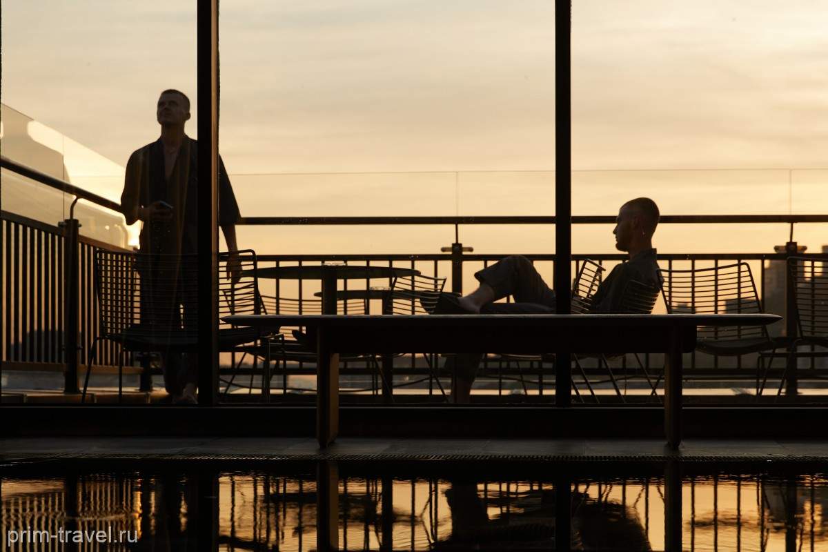 Звучит как план. Бар расположен даже выше ресторана – и, что главное, это классический pool-bar. Так что закажите напитки и потягивайте себе в теплом аромабассейне с идеальным видом на закат – красное солнце над Золотым мостом плюс городские огни.