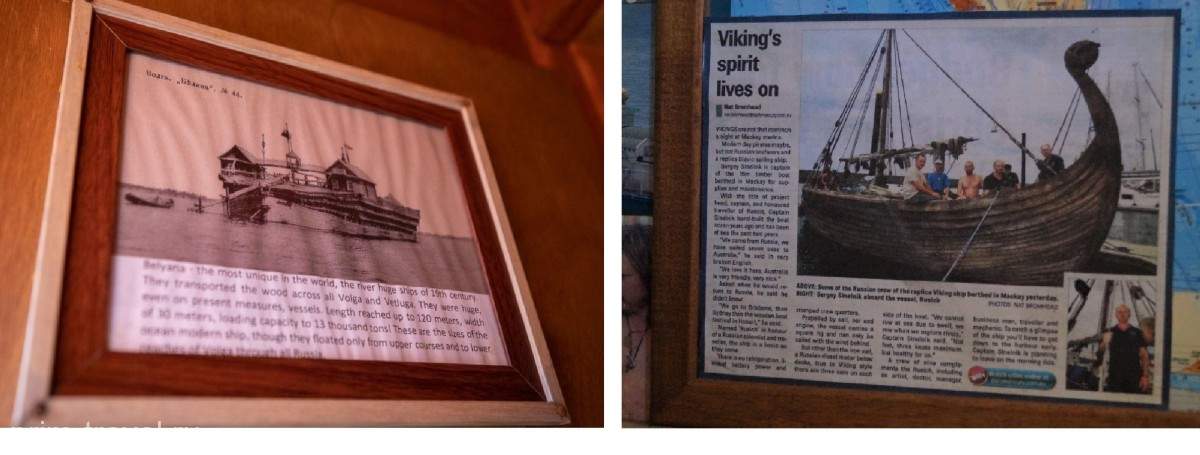 А вот кают-компания – это настоящий мини-музей. Кроме карты похода, газетных вырезок и фотографий, здесь масса моделей старых парусников, церквей, домов… Есть даже лапти и старинная народная игрушка «Мужик и Медведь», которая нынче известна всем. Любовно собраны вырезки из иностранных газет о русском деревянном кораблестроении. На одной запечатлена гигантская 100-метровая деревянная то ли баржа, то ли лодка 19 века, которая могла по Волге перевозить до 13 тысяч тонн груза. Со стороны чем-то напомнила корабль коварной банды «курильщиков» из «Водного мира». Или статья про ладью «Русич» и ее команду, которая через семь морей и Индийский океан и страны ЮВА из российского порта дошла до Австралии. Здесь же, в кают-компании, можно рассмотреть картины кисти самого капитана и его брата-близнеца Александра, который тоже неоднократно ходил на «Пилигриме».