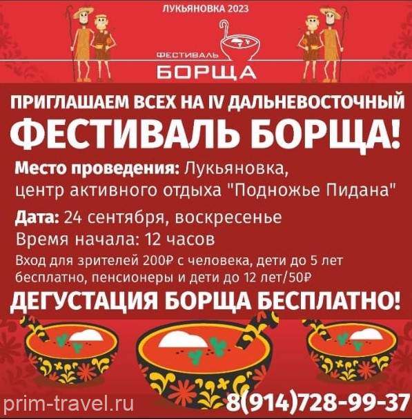 В четвертый раз в Приморье проходит дальневосточный Фестиваль борща. И в четвертый раз площадкой для проведения такого вкусного мероприятия становится центр активного отдыха «Подножье Пидана». Собираются команды из разных уголков Приморья и демонстрируют свое мастерство. У желающих еще есть время собрать свою команду и показать радушие, гостеприимство и секреты приготовления борща.
