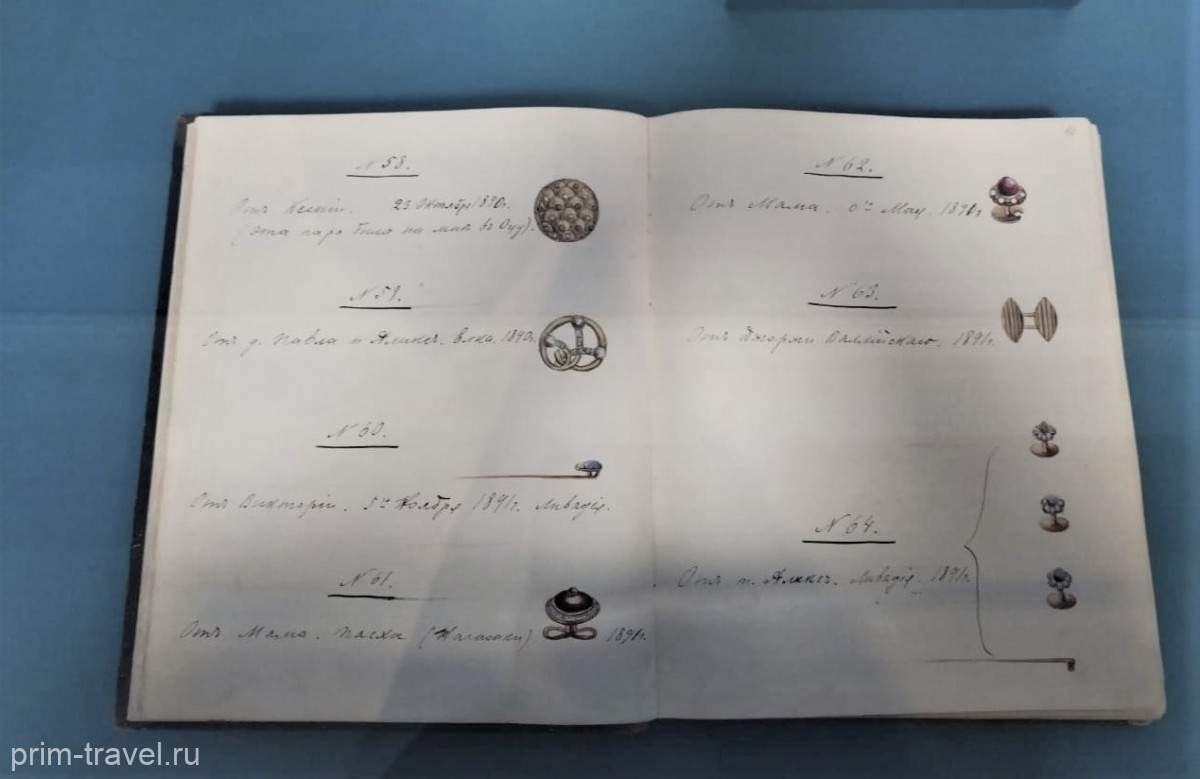 Здесь же, в этом зале представлена записная книжка императора, а на тот момент цесаревича Николая с рисунками ювелирных украшений. Под номером 58 изображены запонки и сделана пояснительная надпись «Эта пара была на мне в г. Оцу». Будущему императору было 23 года, он возвращался с озера Бива в Киото и подвергся нападению полицейского. Кстати, сегодня на том самом месте, где произошло нападение, установлен памятный знак.