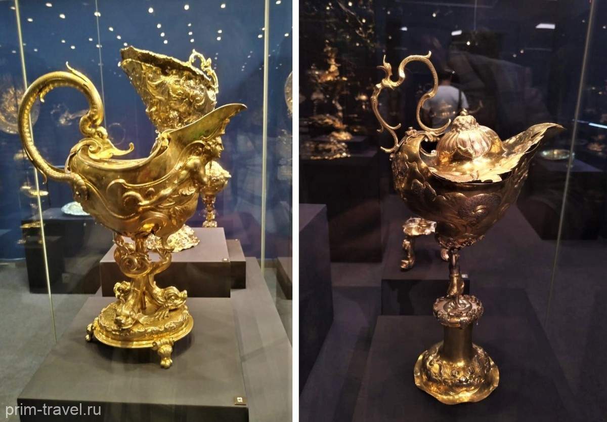 Каждый предмет удивителен: изящен в исполнении, великолепен в игре красок перламутра, искусен работой мастеров, романтичен в своей истории. А начинается выставка с посольских даров, выполненных из серебра с золотым покрытием в роскошном барочном стиле. Лучшее в мире серебро – шведское, английское, аугсбургское XVII — начала XVIII века преподносилось как дипломатические дары. Вот кубок-корабль, с мачтами парусными снастями, бушпритом или рукомойный кувшин в виде морской кентаврессы – эти предметы абсолютно не утилитарные, из них не выпьешь, с ними не сполоснешь руки, зато любоваться можно до бесконечности. Здесь же в зале выставлена скатерть с изображением кораблей, гербов. В первой четверти XVII века ее подарил король Дании русскому царю Михаилу Федоровичу. На сегодня это один из самых больших сохранившихся текстильных предметов, размер скатерти, ее длина чуть более четырех метров.