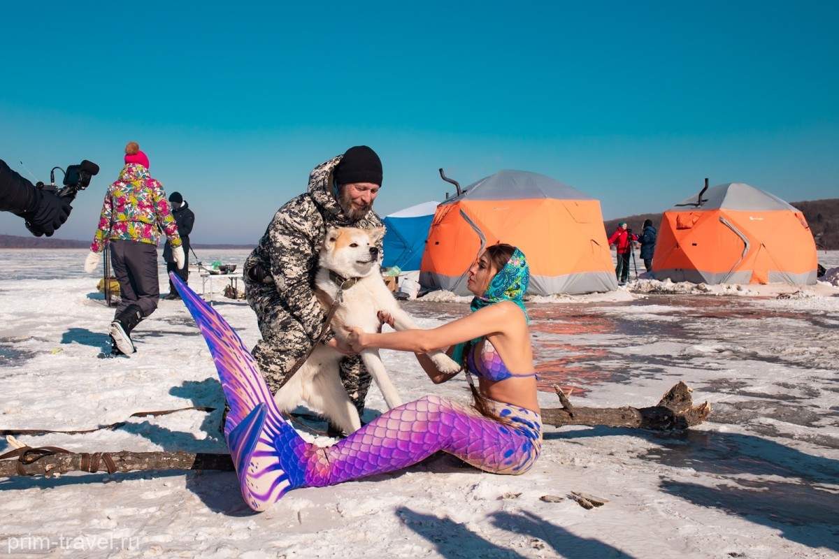 Другая участница рыбалки, Анастасия Слободчикова, вместо пуховика выбрала весьма экстравагантный наряд русалки. Возможно так девушка рассчитывала привлечь к лункам больше рыбы. Рыбка на наряд не клюнула, зато проезжающие мимо рыбаки на машинах оценили образ: они были явно восхищены и подмигивали участникам фестиваля фарами. Русалка стала символом и амбассадором фестиваля.