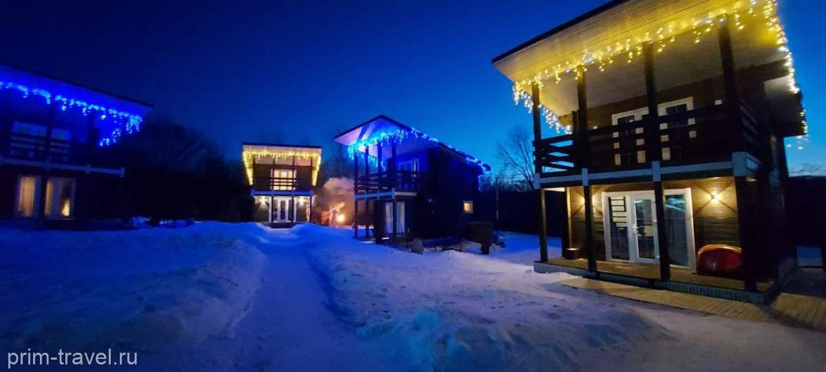 Алёна Беляева рассказывает, что землю для строительства турбазы инициаторы проекта получили в 2021 году. Сегодня на 4 «дальневосточных гектарах» построены 4 гостевых дома вместимостью 4 места каждый. Двухэтажные отапливаемые дома оснащены душевыми, электрическими финскими саунами, санузлами, кухонными зонами, кондиционерами, в них установлены двуспальные диваны на первом этаже и двуспальные кровати на втором. Рядом с каждым домом установлены большие банные чаны, которые используются круглый год, оборудованы мангальные зоны. В интерьерах гостевых домиков применяются натуральные и экологичные материалы. На территории высажены саженцы кедра – заметно, что хозяева турбазы уделяют охране окружающей среды большое внимание.