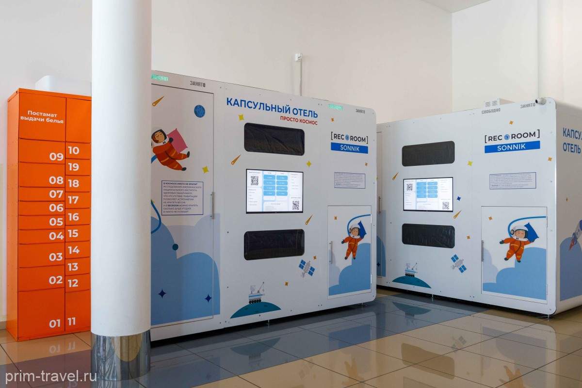 Капсульный отель RecRoom Sonnik – это удобное и быстрое решение для отдыха прямо в аэропорту. Номера представляют собой спальные ячейки. Теперь пассажирам не нужно выезжать в город и искать гостиницу, чтобы переждать пересадку между рейсами. Пространство для сна и отдыха находится прямо в аэропорту в общей зоне на третьем этаже аэровокзала. В отеле действует почасовая оплата, автоматизированная регистрация избавит от лишнего оформления и ускорит процесс заселения.