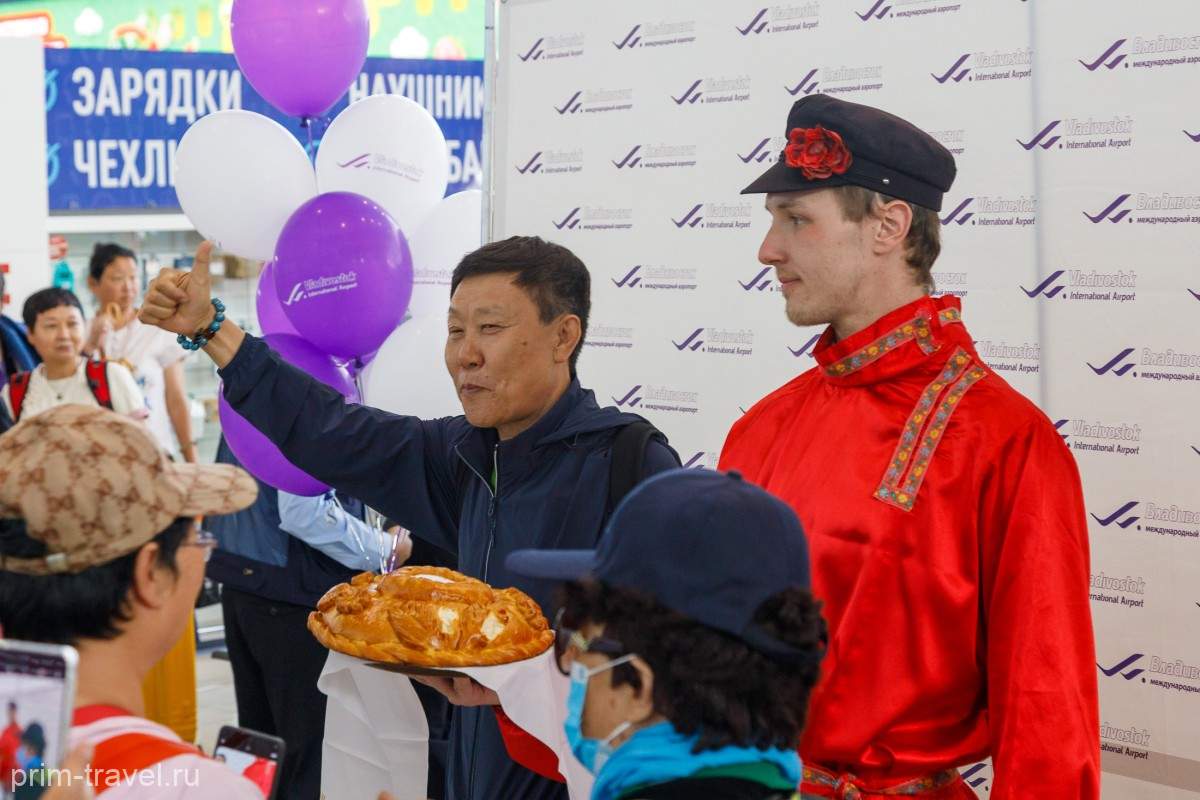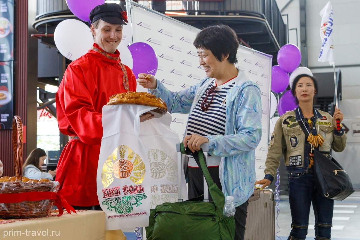 В аэровокзальном комплексе была организована торжественная программа. На выходе из зоны международных авиалиний размещались приветственный баннер и шары. Еще не отправившись в путешествие по краю, гости уже смогли увидеть элементы русской культуры – народные костюмы, самовар, хлеб-соль. Первым рейсом прилетело чуть более 100 пассажиров. В основном это были организованные группы туристов, у которых уже была сформирована программа знакомства с Владивостоком.
