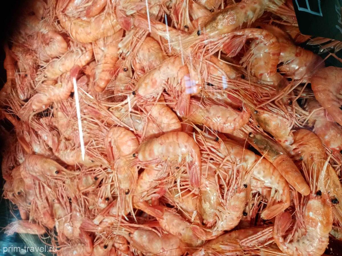 - Креветки – розовые, хвостик свернут колечком (черная голова – признак испорченности).