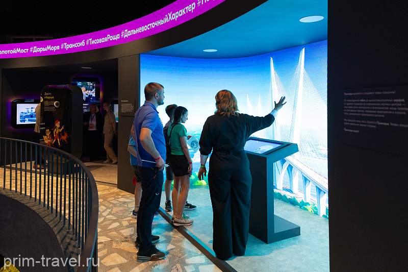 Экскурсоводы не только рассказывают очень много интересной информации, но и показывают, как пользоваться теми или иными цифровыми материалами. Посетителям показывают интерактивные зоны и рассказывают о ключевых экспозициях центра: «Грани Приморья», инсталляции «Маяк», «Подводный мир и изучение Японского моря», «Тропа удэге», «Горные вершины», «Ворота в Азию», «Рыбная промышленность» и многих других.