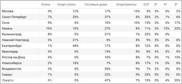 Наиболее динамично растущими направлениями стали Казань, Санкт-Петербург и Сочи. В Татарстане номерной фонд классических отелей увеличился на 10%, особенно заметно расширился сегмент 5- и 4-звездочных отелей. В Северной Пальмире прирост апарт-отелей составил 25%, гостевых домов – 37%, а в бюджетной категории без звезд рост предложений увеличился на 25%. В курортном Сочи активно развивался премиальный сегмент: число отелей категории пять звезд увеличилось на 17%. Калининград показал рост в категории без звезд, одна и две звезды (+22%) и в сегменте гостевых домов (+21%). В Екатеринбурге наиболее заметной стала динамика апарт-отелей (+44%), во Владивостоке – гостевых домов (+35%), в Сириусе – бюджетного сегмента без звезд, одна и две звезды (+23%), а также малых гостевых домов (+22%).